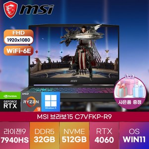 MSI 노트북 BRAVO 15 C7VFKP-R9 AMD 라이젠9-7940HS/RTX4060 고성능 게이밍 노트북, MSI 노트북 BRAVO 15 C7VFKP-R9, WIN11 Pro, 32GB, 512GB, 라이젠9, 블랙